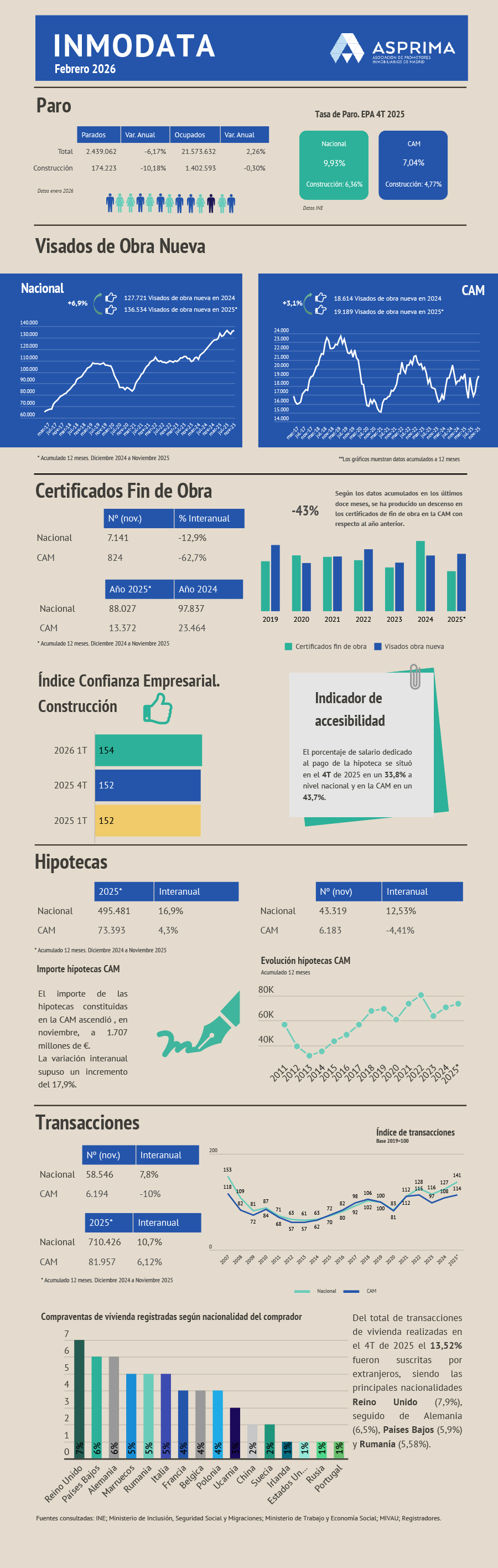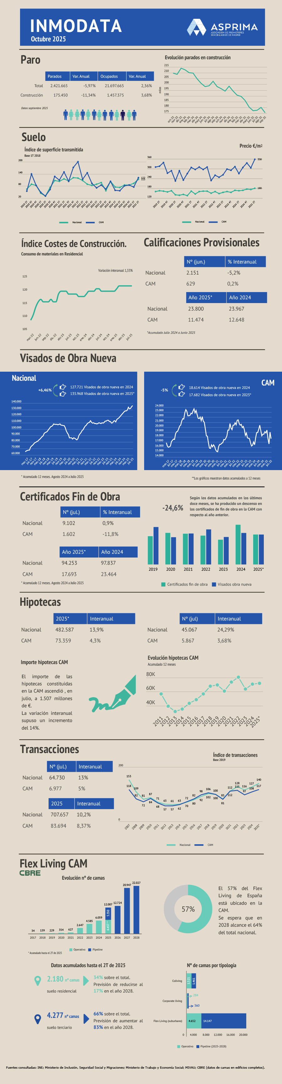 La Asociación de Promotores Inmobiliarios de Madrid (ASPRIMA) acaba de difundir su último informe Inmodata, en el que sintetiza las magnitudes estadísticas básicas del sector de la construcción y la edificación.