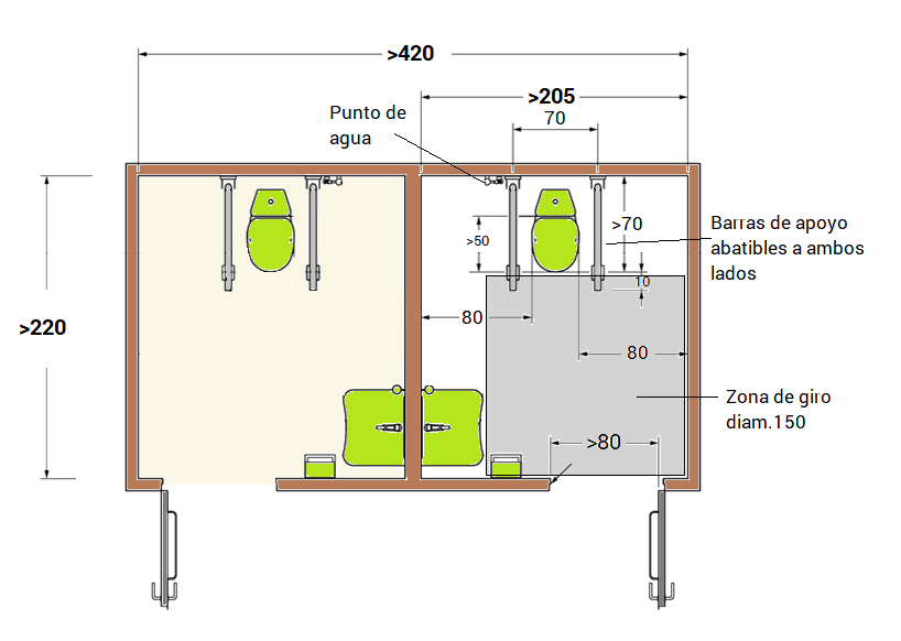 - Hay un espacio de transferencia lateral de anchura ≥ 80 cm y ≥ 75 cm de fondo hasta el borde frontal del inodoro. En uso público, espacio de transferencia se exige a ambos lados.