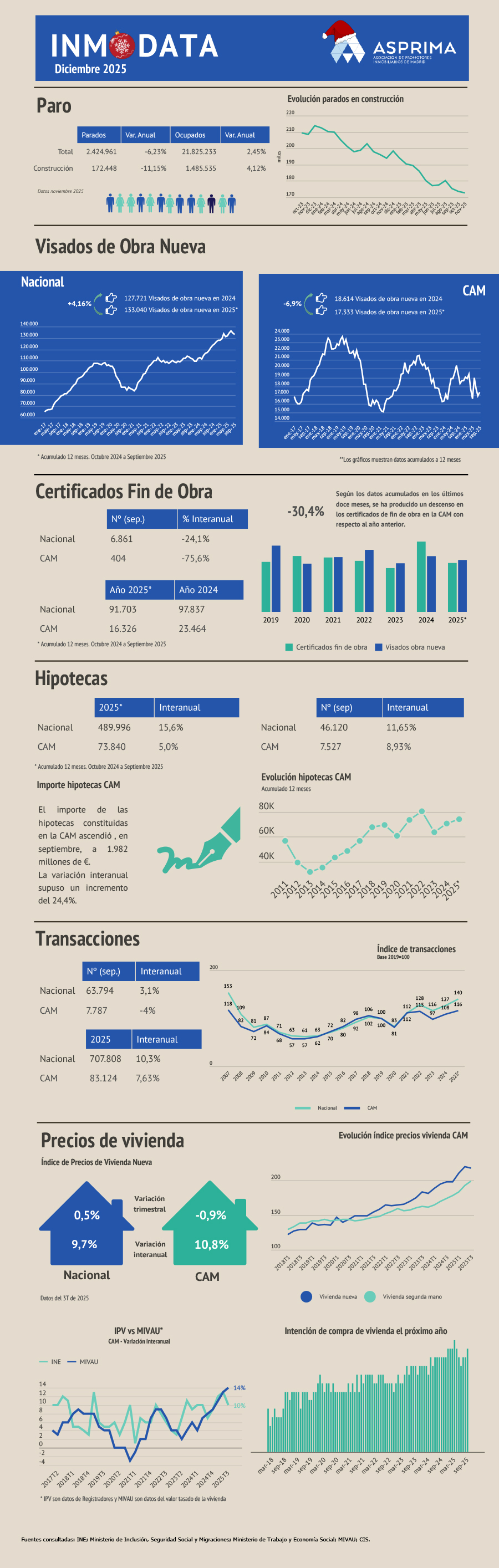 La Asociación de Promotores Inmobiliarios de Madrid (ASPRIMA) acaba de difundir su último informe Inmodata, en el que sintetiza las magnitudes estadísticas básicas del sector de la construcción y la edificación.