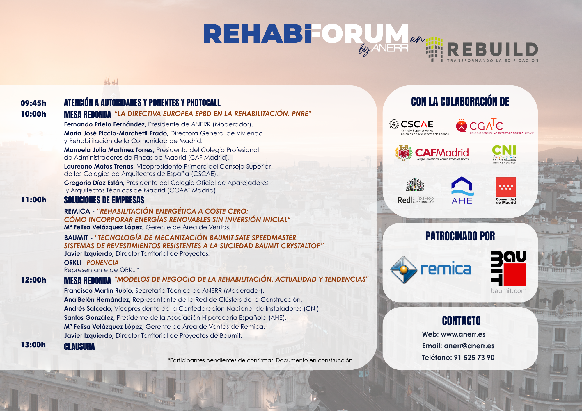 El próximo 25 de marzo de 2026 se celebrará la jornada Rehabiforum de ANERR, dentro del Congreso Nacional REBUILD en IFEMA Madrid, que será punto de encuentro del sector Rehabilitación de Edificios y Reformas de Viviendas, ante las instituciones, de las empresas de reforma y rehabilitación, con los profesionales técnicos proyectistas, con los administradores de fincas, con los instaladores, en definitiva, estarán presentes todos los actores de nuestro ecosistema.